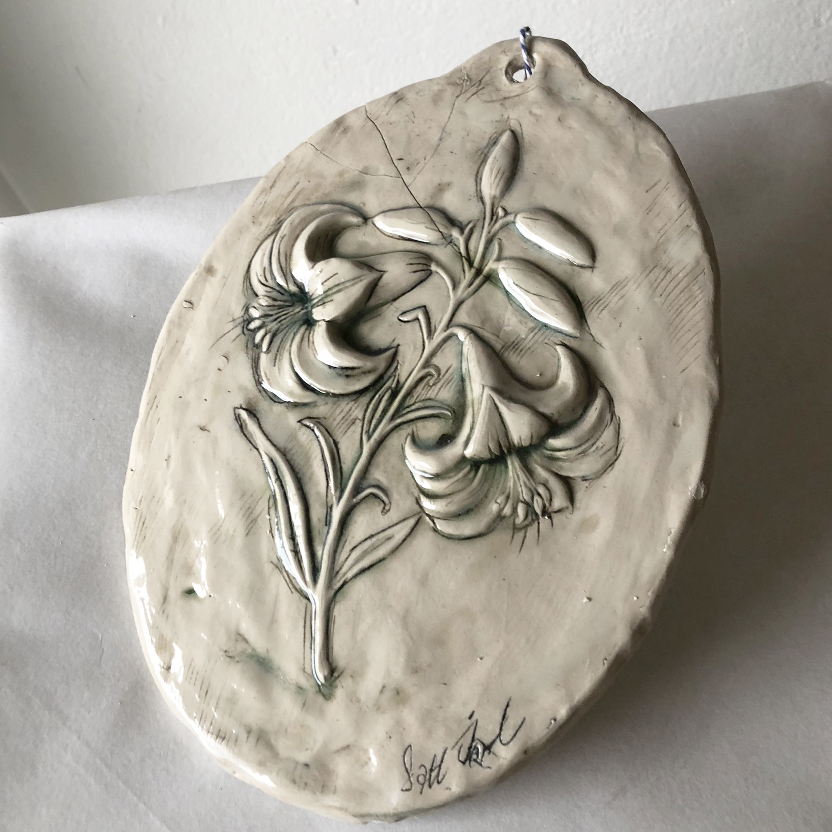 Tavla i keramik med liljor. Gjord för hand med hjälp av gjuten form med liljor, i vit stengodslera och mineralerna järn och koppar som ger färg genom den transparent glasyren.