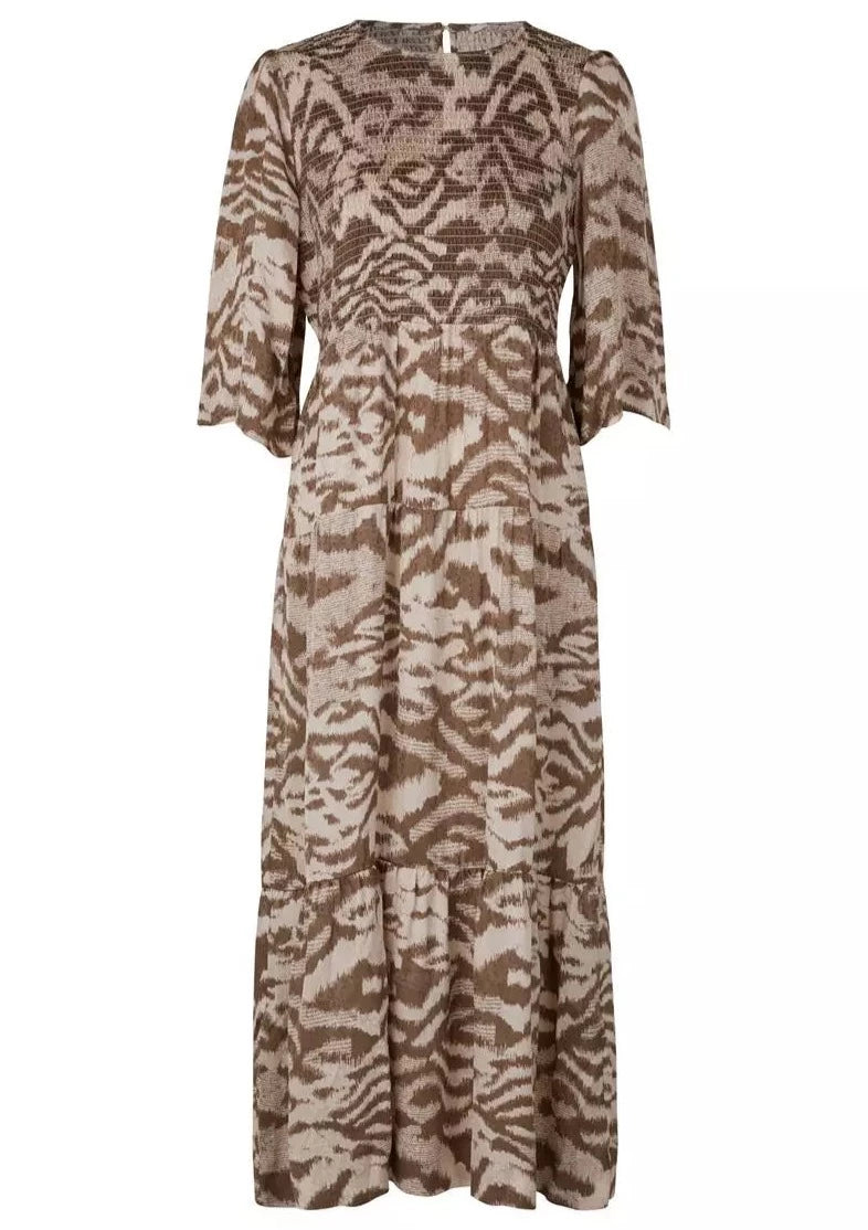Maxiklänning Djurprint Viskos 100% Smock på överdelen Knäppning i nacken med en knapp 30 grader fintvätt Strykes ut i fuktigt tillstå...