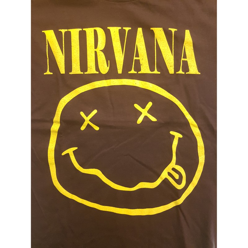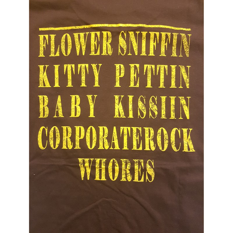 Klassisk t-shirt med Nirvanas snygga smiley framtill. På ryggen har vi “Flower Sniffin’ Kitty Pettin’ Baby Kissin’ Corporate Rock Whores” en text som Kurt tryckte på en t-shirt.