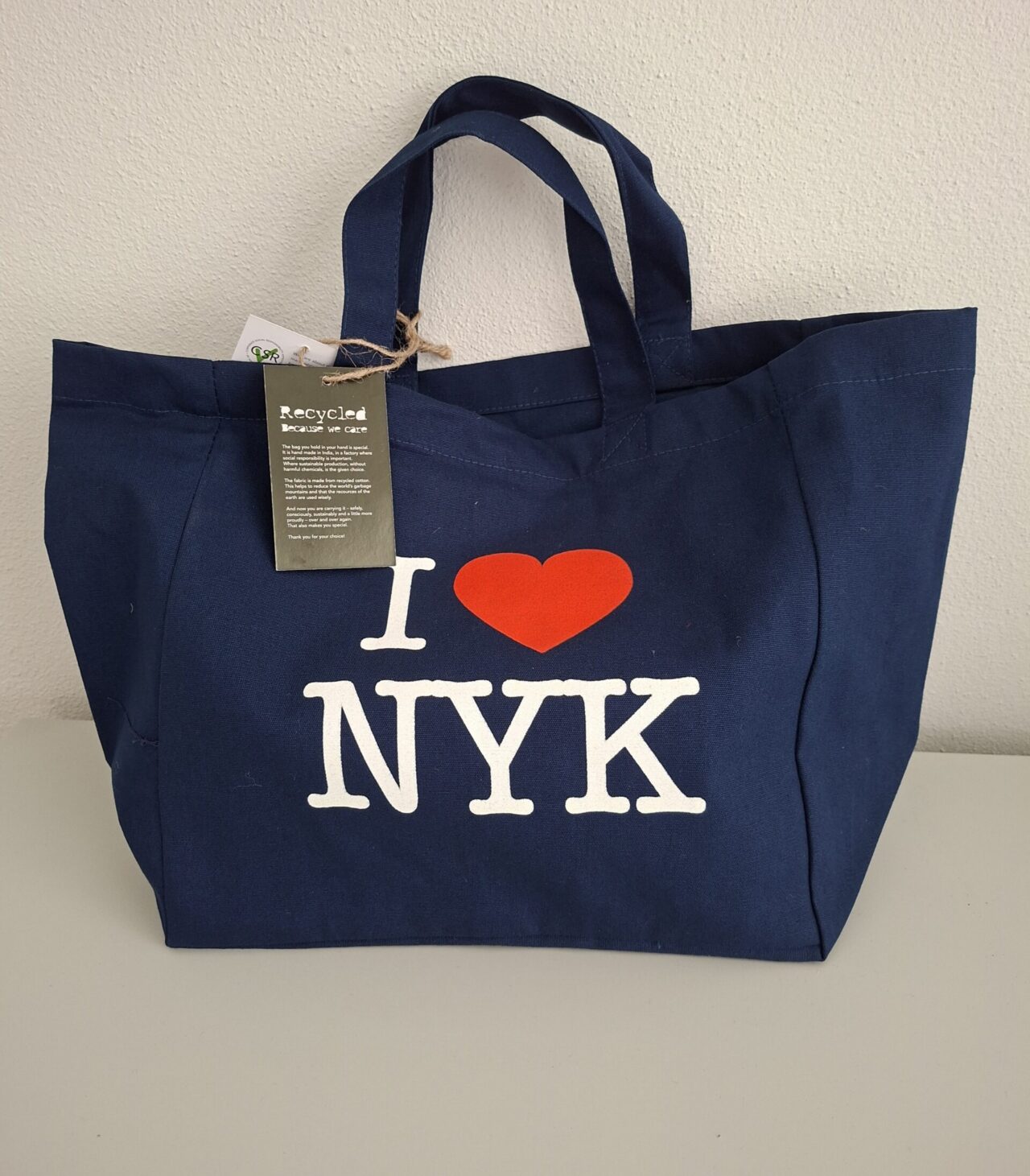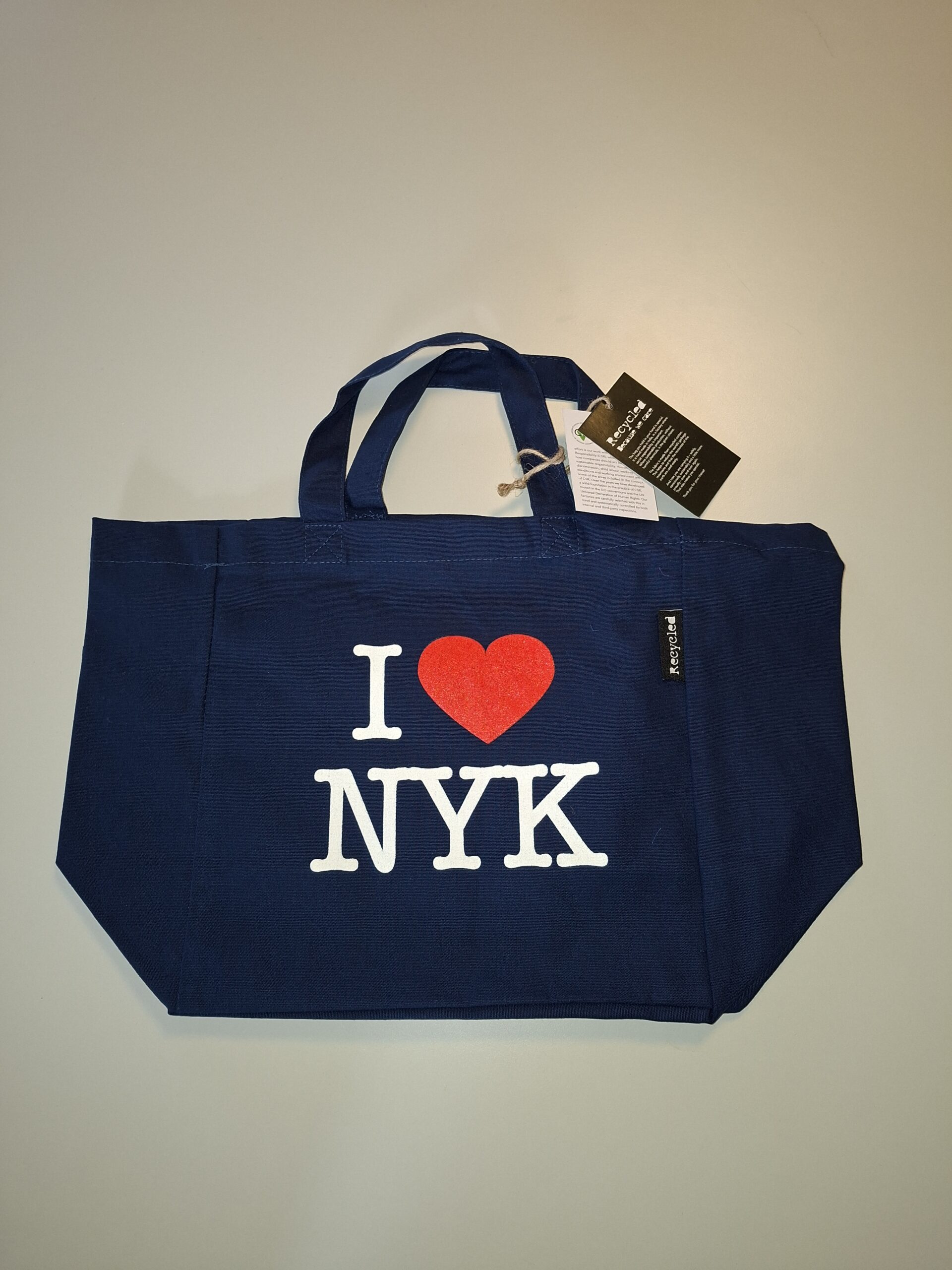 I LOVE NYK kasse i marinblå. Tyget är tillverkat i återvunnen bomull.