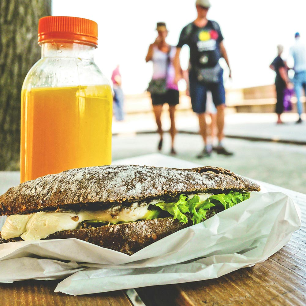 Förboka ett paket med goda mackor på nybakat bröd, frukt och färskpressad apelsinjuice för två personer. Perfekt att ta med på utflykten, till cupen på Rosvalla, eller som mellanmål på hemresan.