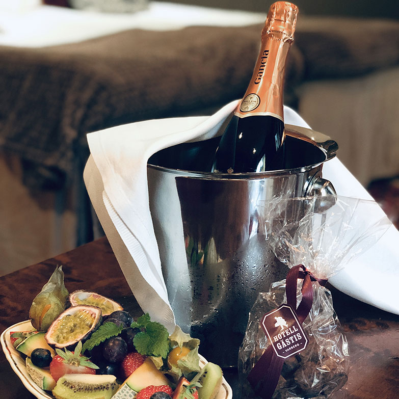 Lyxa till det med en flaska bubbel, handgjorda praliner och ett fruktfat som väntar på rummet.