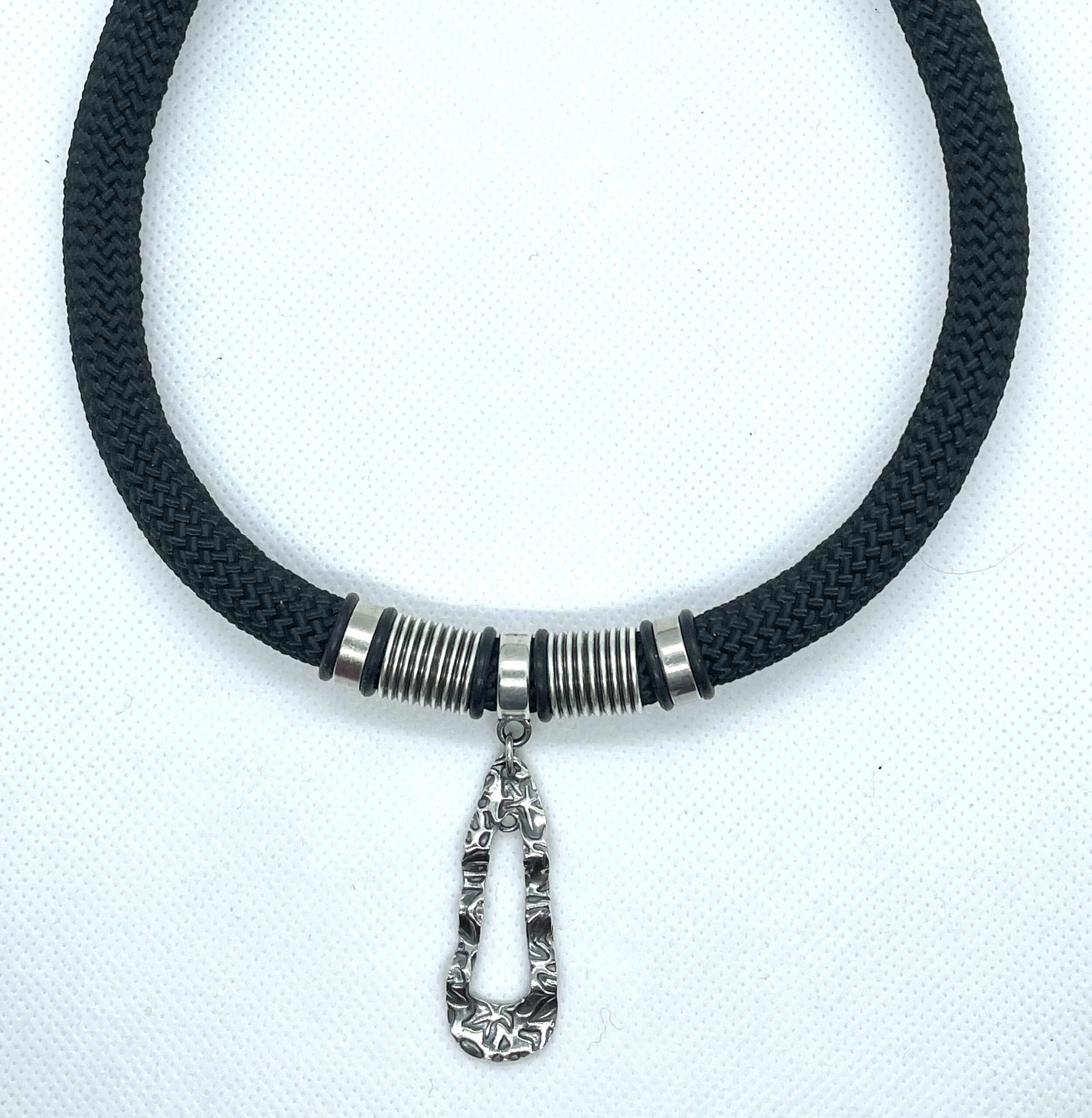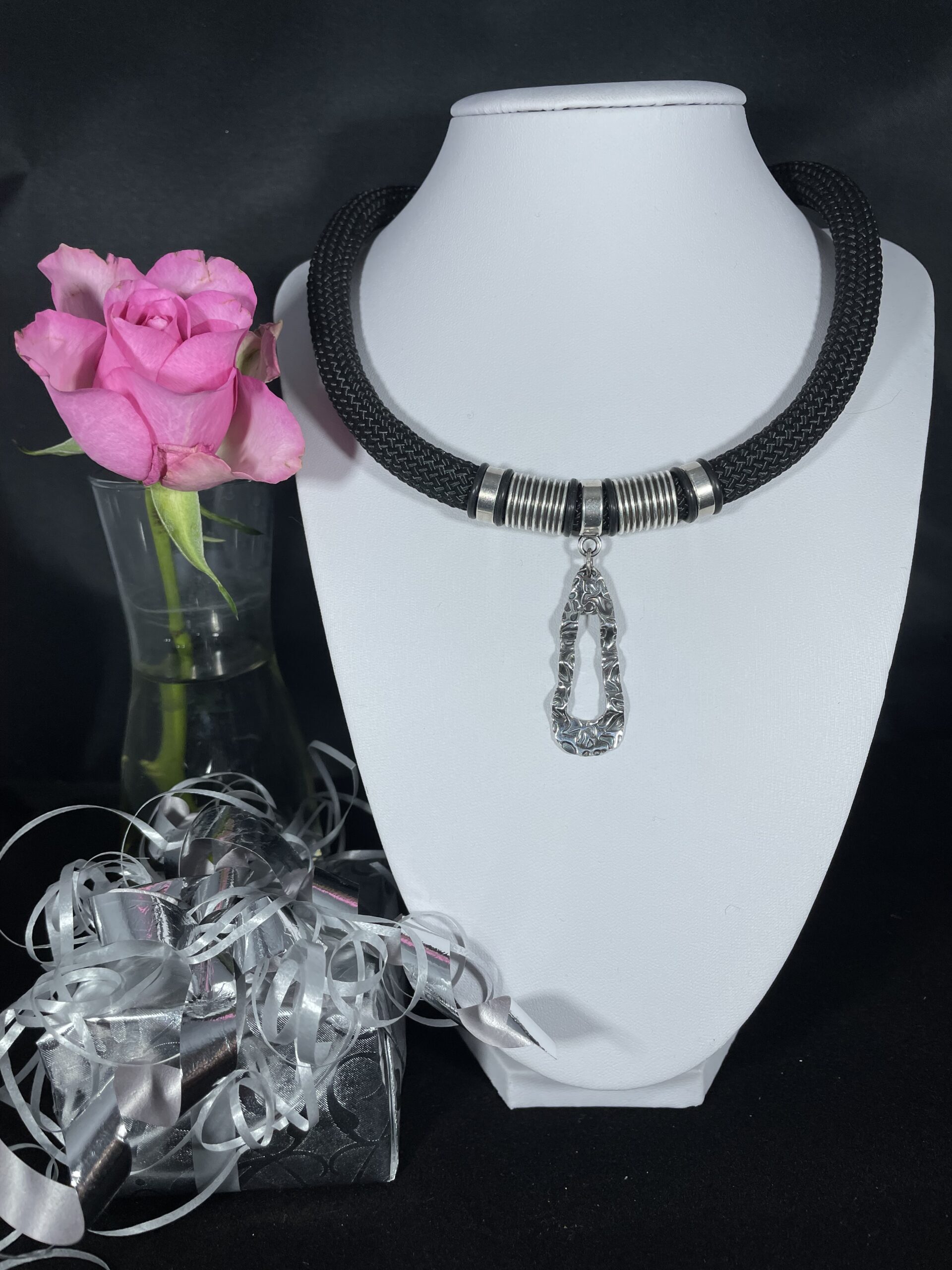 Ett iögonfallande halsband med ett vackert silverhänge gjort i finsilver (FS999), med räfflade metalldelar runt hänget.