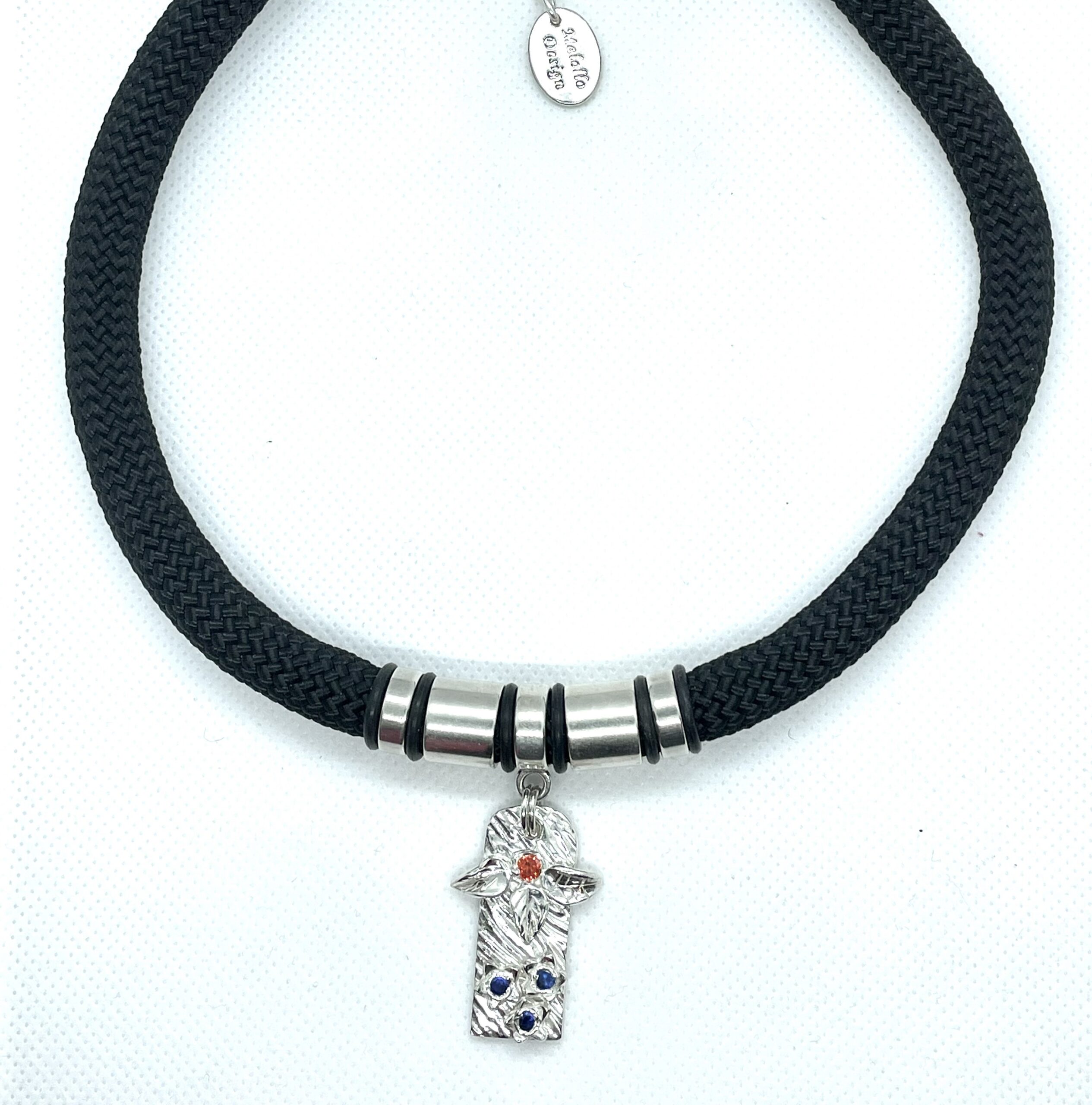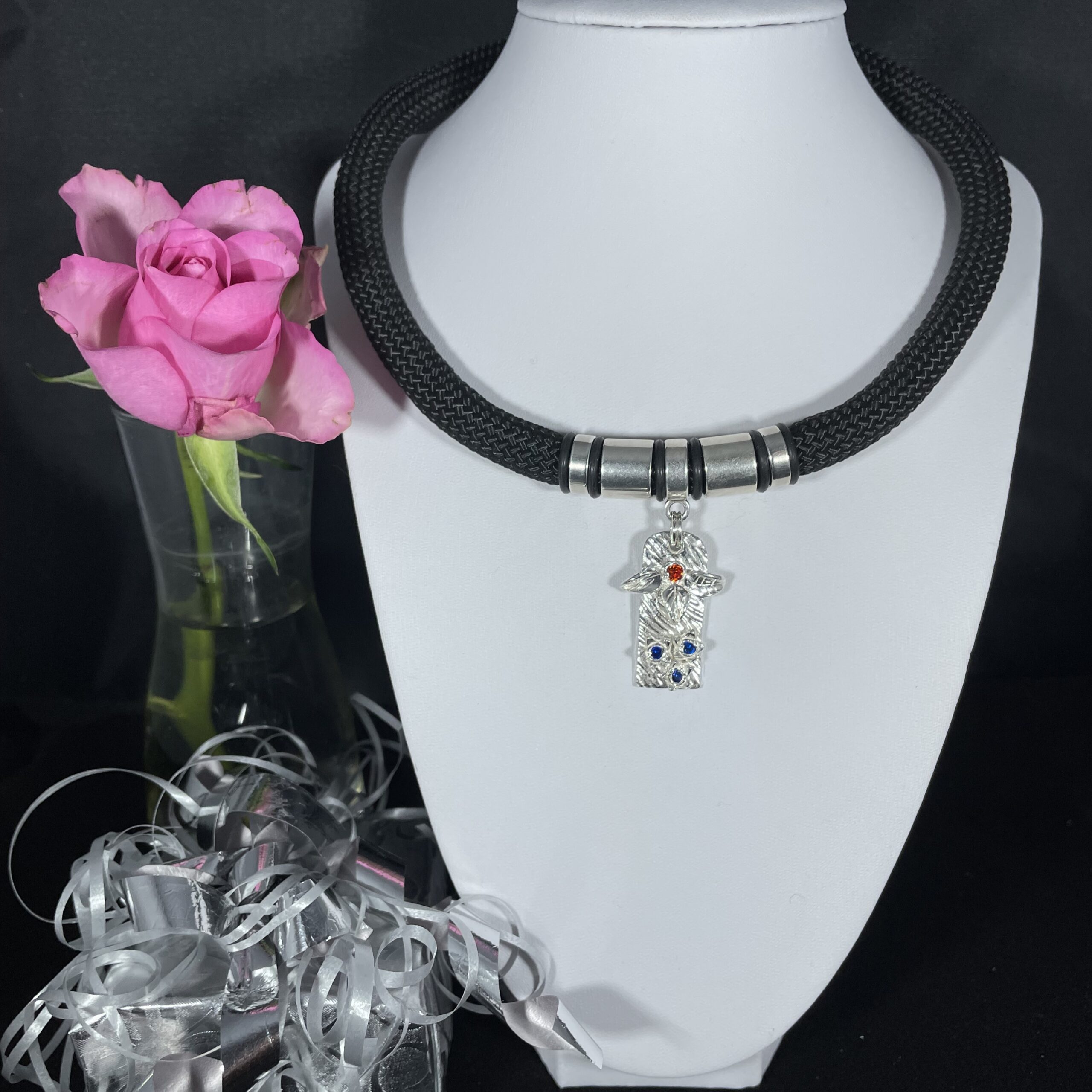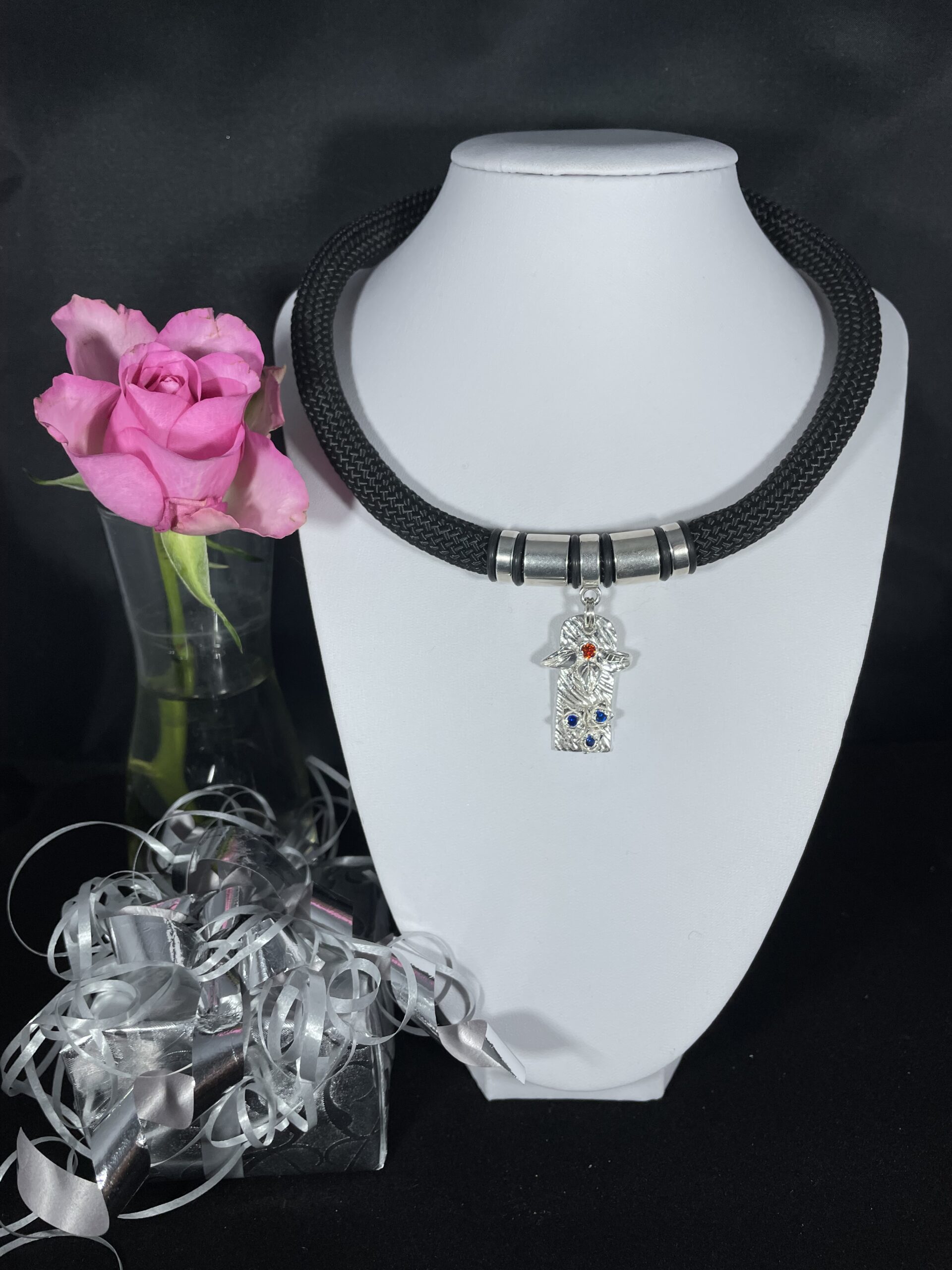 Ett romantiskt halsband med ett vackert silverhänge gjort i finsilver (FS999) samt en röd och tre blå zirkoner, med släta silverfärgade metalldelar runt hänget.
