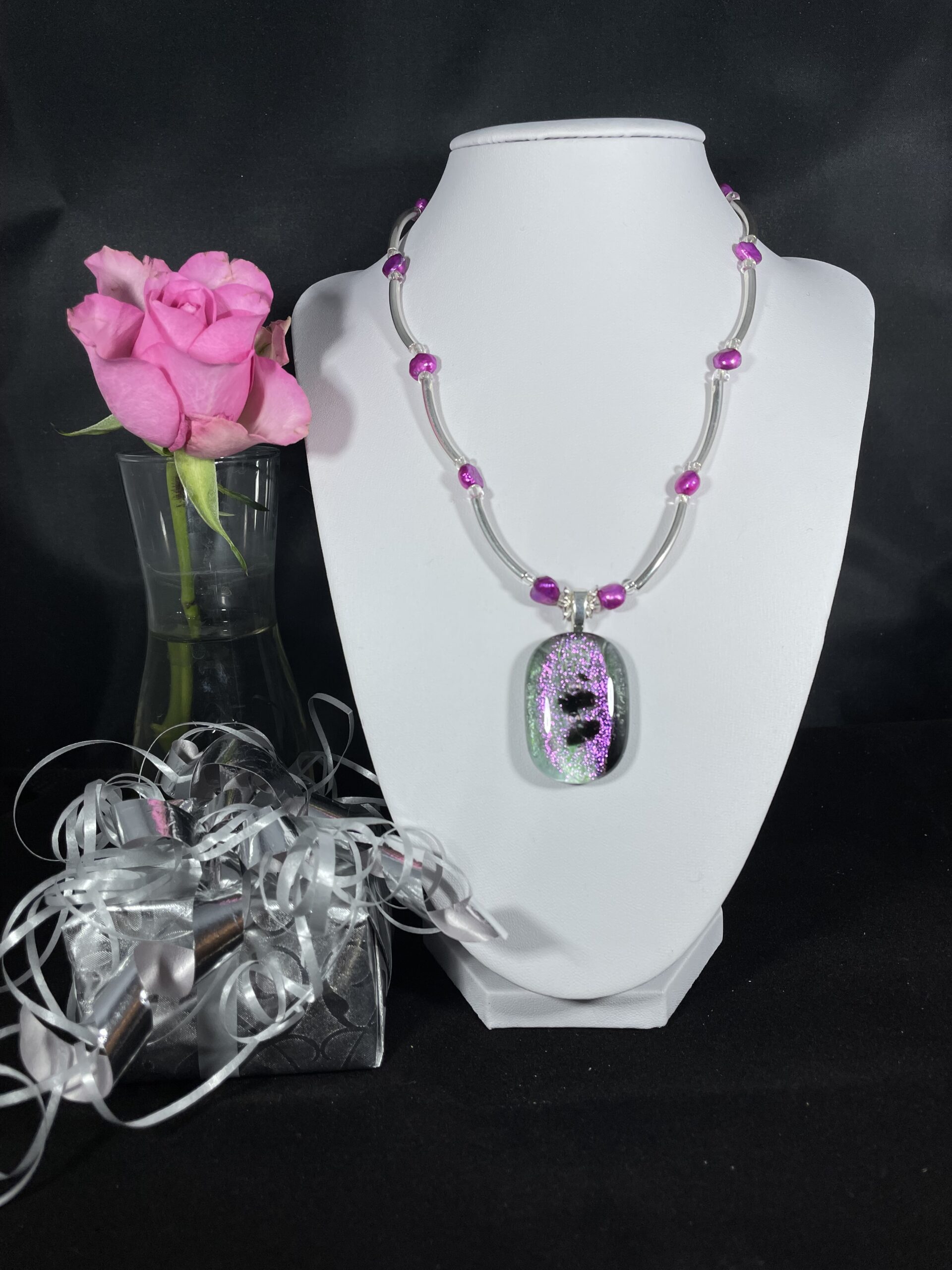 Vackert silverhalsband (SS925) med en underbar rosagnistrande glassten Hängets längd är 42 cm + 5 cm förlängningskedja för att kunna j... Läs mer